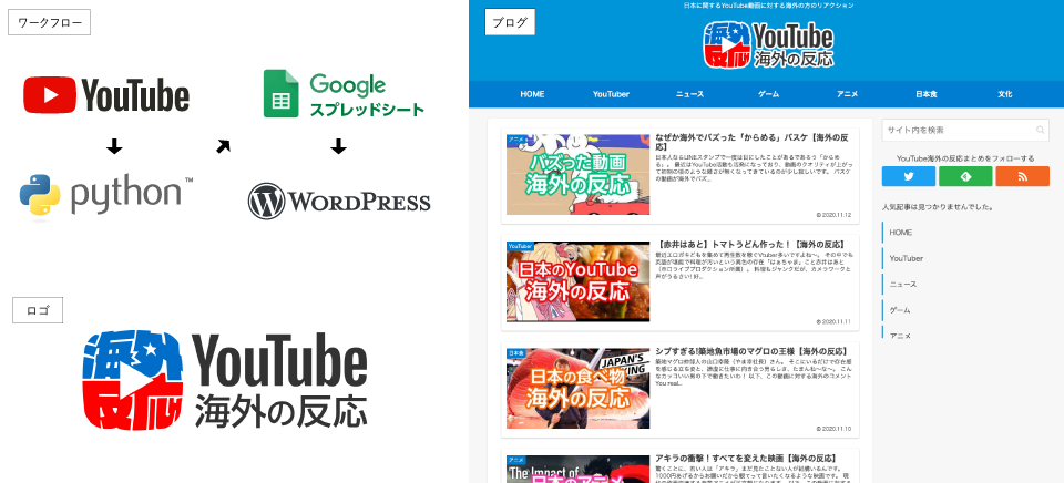 YouTubeからテキストとサムネイル画像を「Python」にてスクレイピングし、スプレッドシートにて自動翻訳+成形したものをワードプレスにコピペしています。